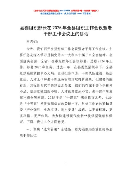 / 县委组织部长在2025年全县组织工作会议暨老干部工作会议上的讲话