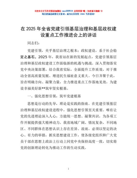 / 在2025年全省党建引领基层治理和基层政权建设重点工作推进会上的讲话