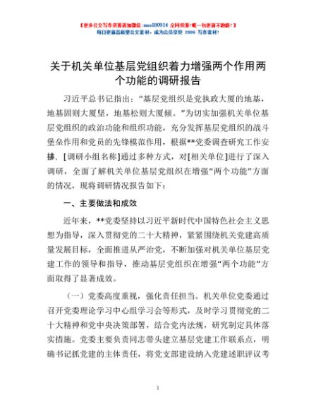 / 关于机关单位基层党组织着力增强两个作用两个功能的调研报告
