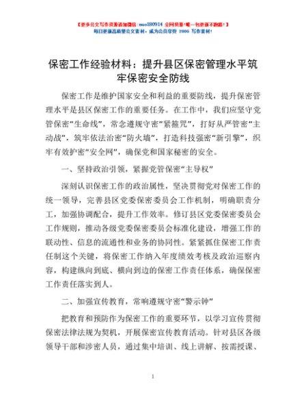 / 保密工作经验材料:提升县区保密管理水平 筑牢保密安全防线