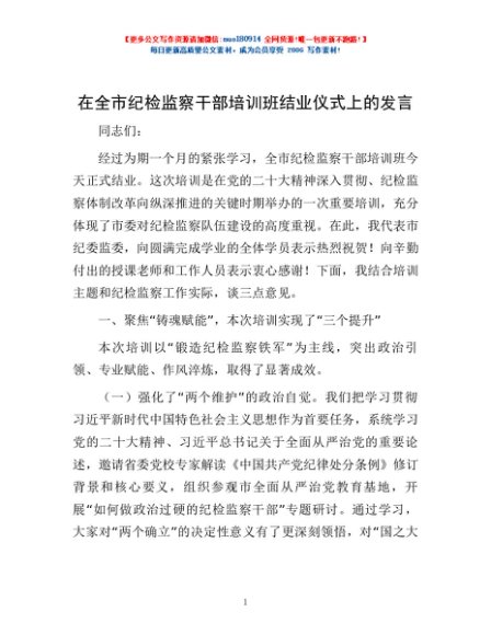 / 在全市纪检监察干部培训班结业仪式上的发言
