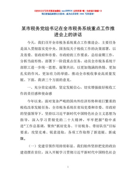 / 某市税务党组书记在全市税务系统重点工作推进会上的讲话