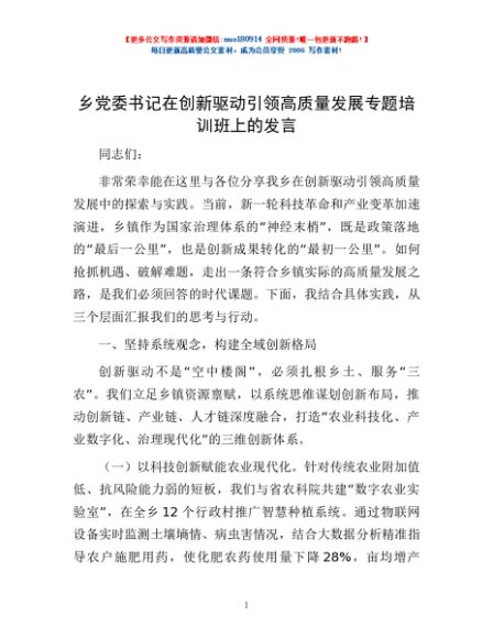 / 乡党委书记在创新驱动引领高质量发展专题培训班上的发言