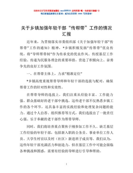 / 关于乡镇加强年轻干部“传帮带”工作的情况汇报