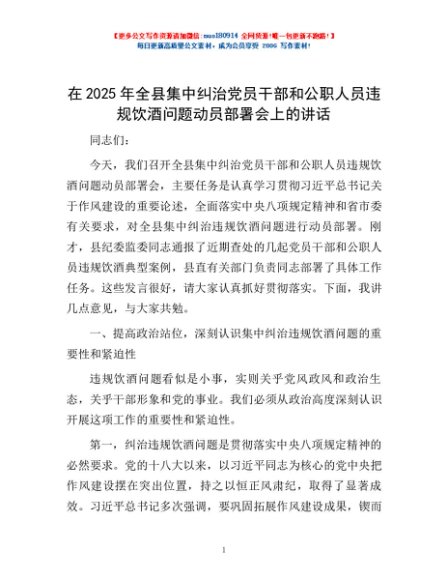 / 在2025年全县集中纠治党员干部和公职人员违规饮酒问题动员部署会上的讲话