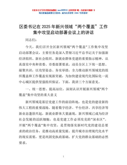 / 区委书记在2025年新兴领域“两个覆盖”工作集中攻坚启动部署会议上的讲话