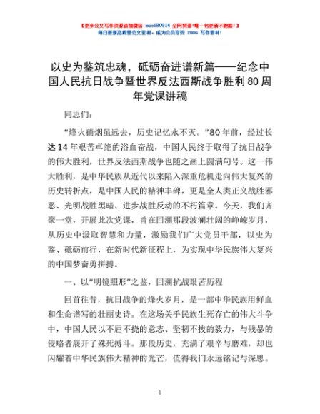 / 以史为鉴筑忠魂,砥砺奋进谱新篇——纪念中国人民抗日战争暨世界反法西斯战争胜利80周年党课讲稿