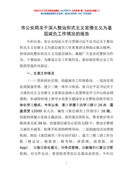 / 市公安局关于深入整治形式主义官僚主义为基层减负工作情况的报告