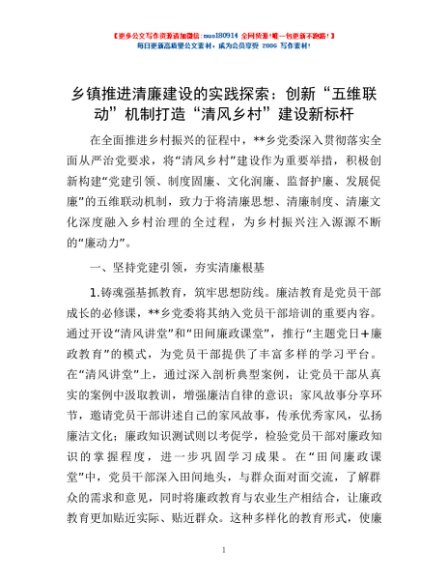 / 乡镇推进清廉建设的实践探索:创新“五维联动”机制打造“清风乡村”建设新标杆