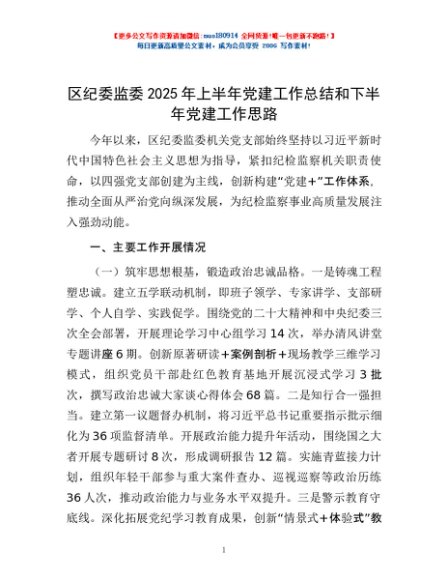 / 区纪委监委2025年上半年党建工作总结和下半年党建工作思路