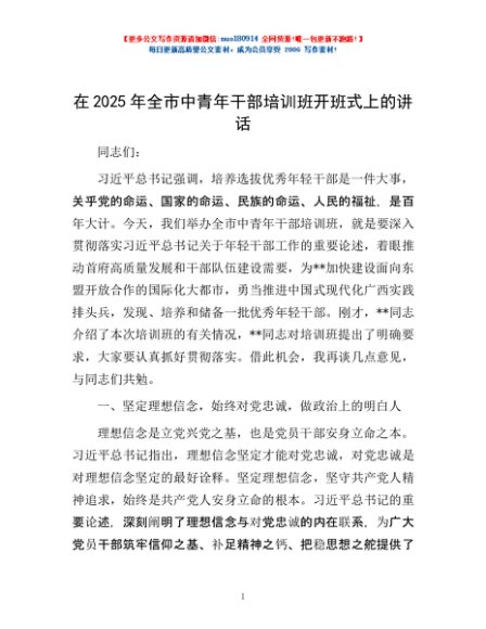 / 在2025年全市中青年干部培训班开班式上的讲话