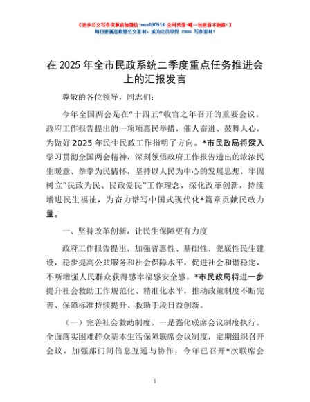 / 在2025年全市民政系统二季度重点任务推进会上的汇报发言