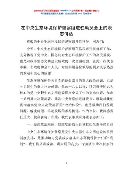 / 在中央生态环境保护督察组进驻动员会上的表态讲话