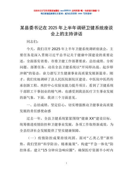 / 某县委书记在2025年上半年调研卫健系统座谈会上的主持讲话