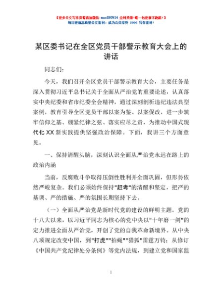 / 某区委书记在全区党员干部警示教育大会上的讲话