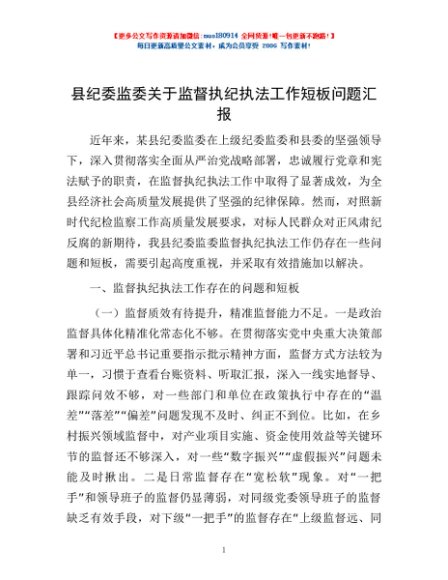 / 县纪委监委关于监督执纪执法工作短板问题汇报