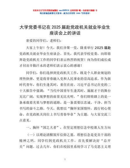 / 大学党委书记在2025届赴党政机关就业毕业生座谈会上的讲话