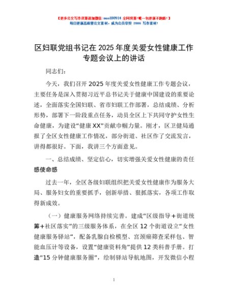 / 区妇联党组书记在2025年度关爱女性健康工作专题会议上的讲话