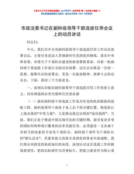 / 市政法委书记在副科级领导干部选拔任用会议上的动员讲话