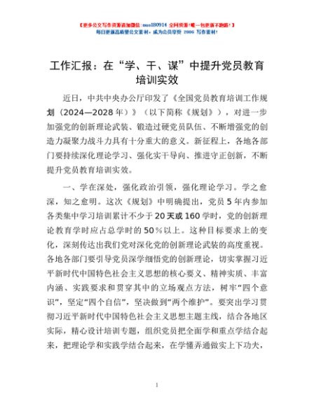 工作汇报:在“学、干、谋”中提升党员教育培训实效
