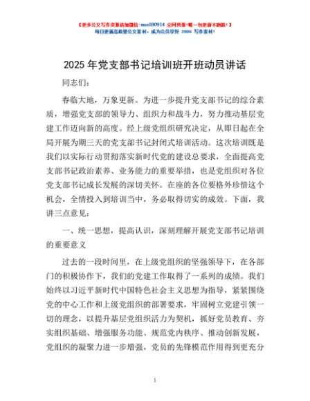 2025年党支部书记培训班开班动员讲话