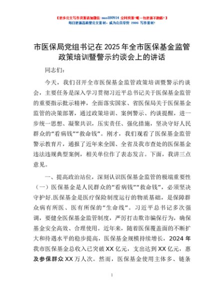 / 市医保局党组书记在2025年全市医保基金监管政策培训暨警示约谈会上的讲话