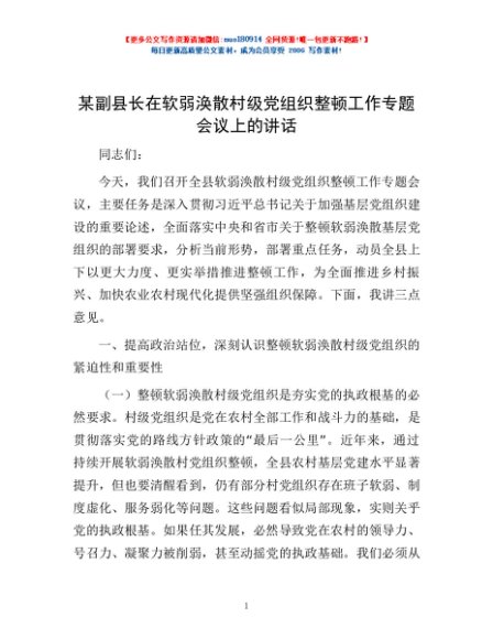 / 某副县长在软弱涣散村级党组织整顿工作专题会议上的讲话