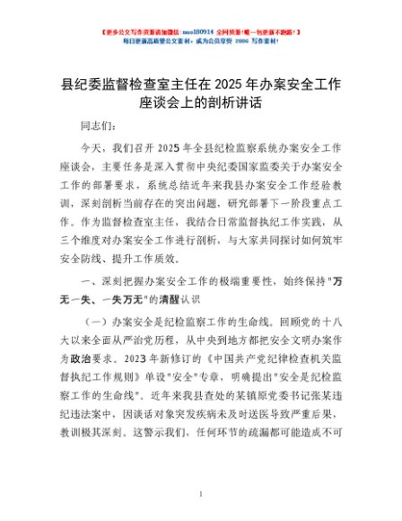 / 县纪委监督检查室主任在2025年办案安全工作座谈会上的剖析讲话
