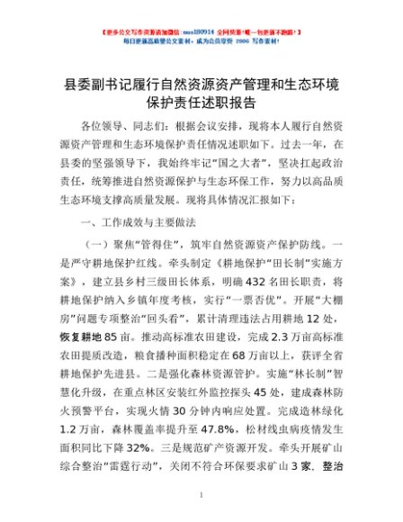 / 县委副书记履行自然资源资产管理和生态环境保护责任述职报告