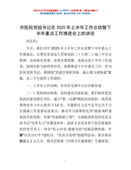 / 市医院党组书记在2025年上半年工作总结暨下半年重点工作推进会上的讲话