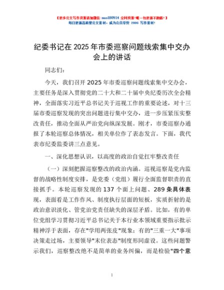 / 纪委书记在2025年市委巡察问题线索集中交办会上的讲话