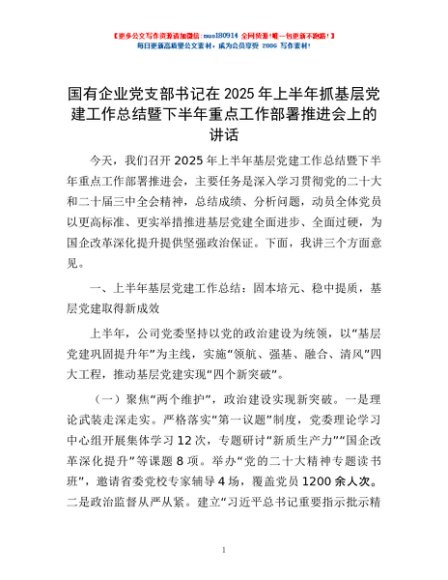 / 国有企业党支部书记在2025年上半年抓基层党建工作总结暨下半年重点工作部署推进会上的讲话