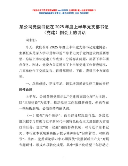 / 某公司党委书记在2025年度上半年党支部书记(党建)例会上的讲话