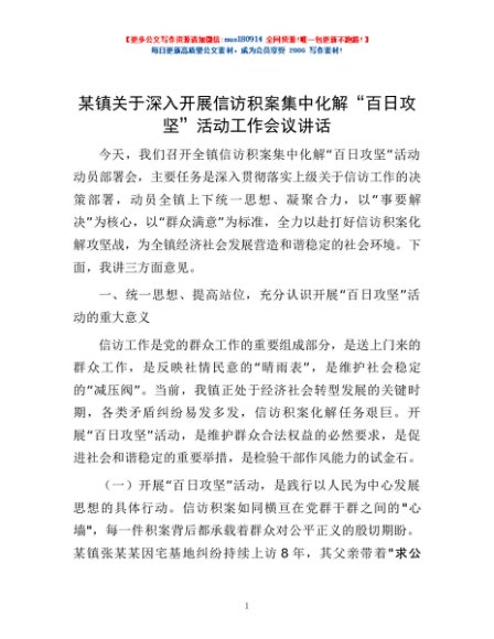 / 某镇关于深入开展信访积案集中化解“百日攻坚”活动工作会议讲话