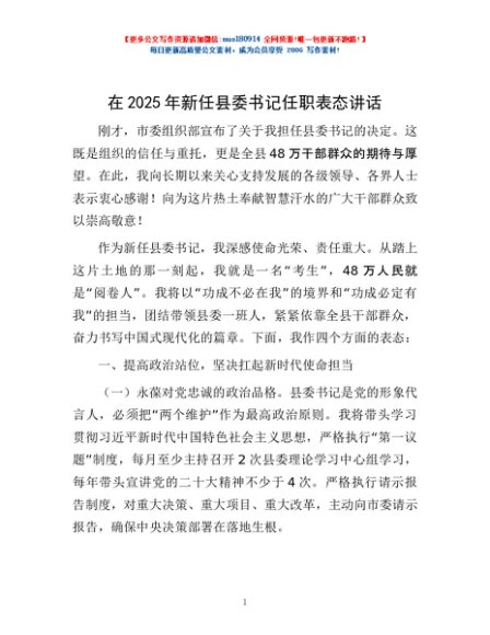 / 在2025年新任县委书记任职表态讲话
