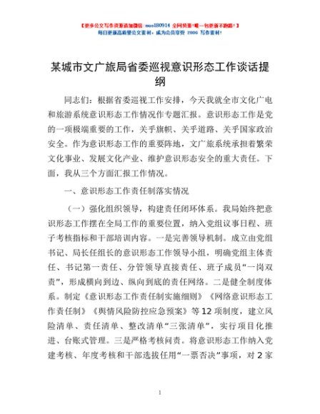 / 某城市文广旅局省委巡视意识形态工作谈话提纲