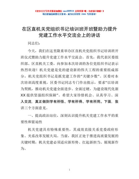 / 在区直机关党组织书记培训班开班暨助力提升党建工作水平交流会上的讲话