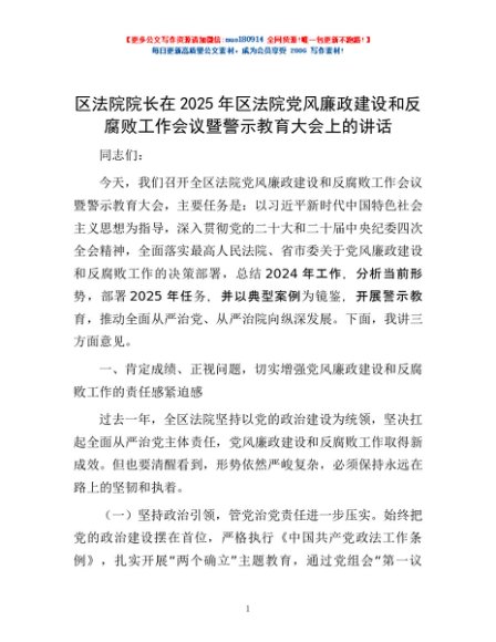 / 区法院院长在2025年区法院党风廉政建设和反腐败工作会议暨警示教育大会上的讲话