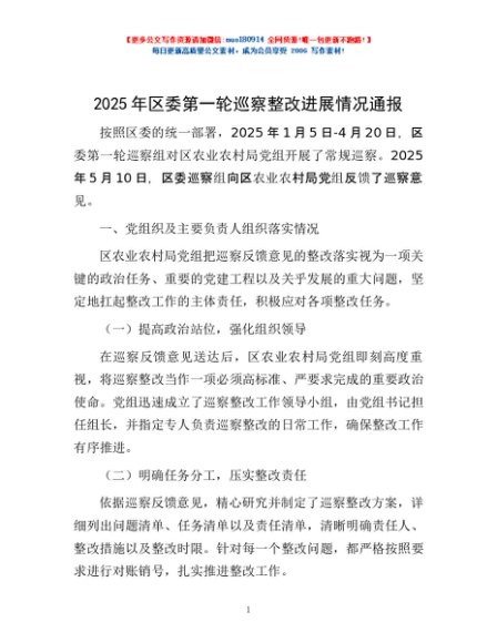 2025年区委第一轮巡察整改进展情况通报