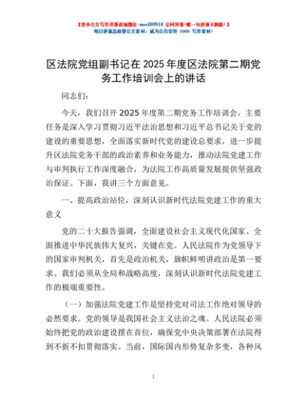 / 区法院党组副书记在2025年度区法院第二期党务工作培训会上的讲话