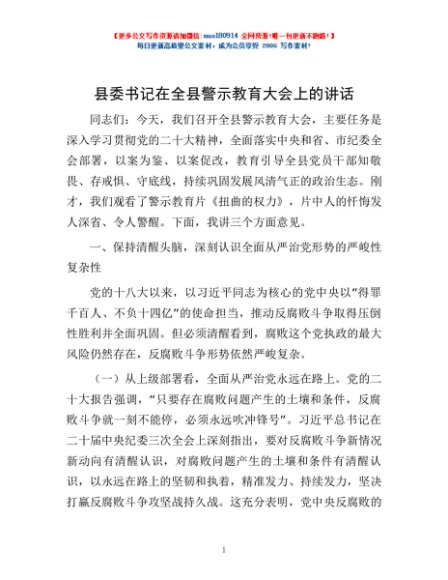 / 县委书记在全县警示教育大会上的讲话