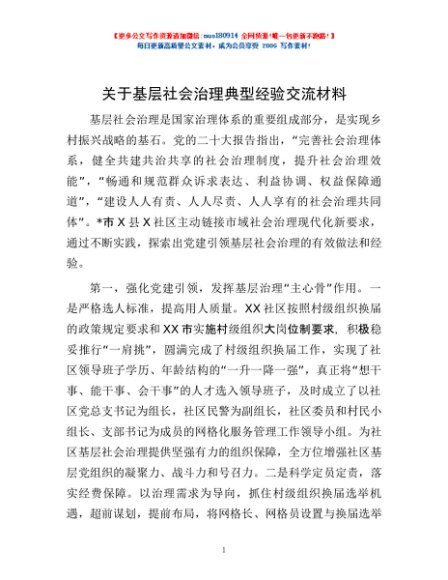 / 关于基层社会治理典型经验交流材料