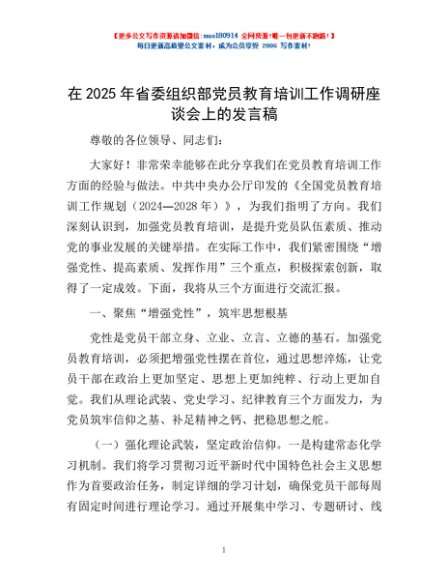 / 在2025年省委组织部党员教育培训工作调研座谈会上的发言稿