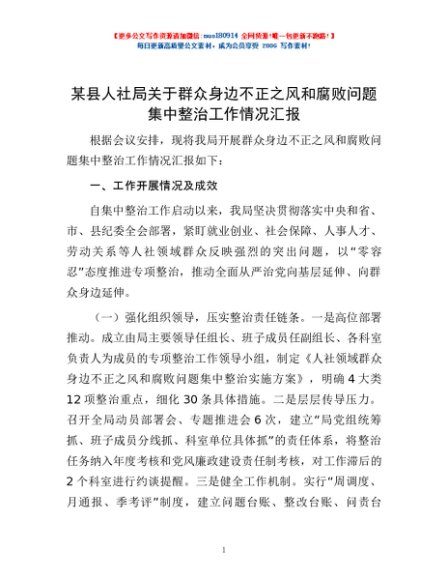/ 某县人社局关于群众身边不正之风和腐败问题集中整治工作情况汇报
