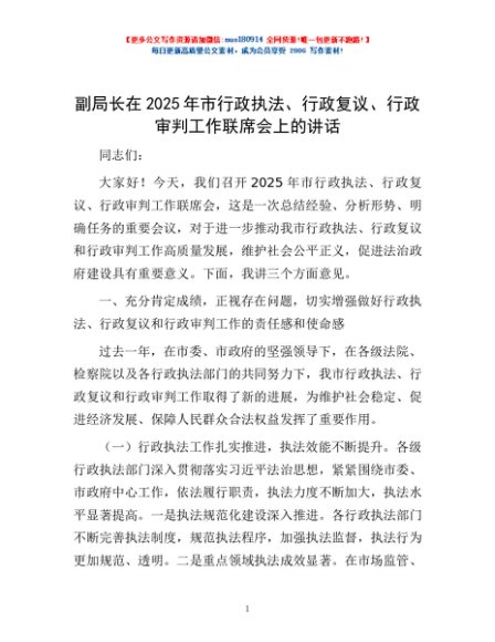 / 副局长在2025年市行政执法、行政复议、行政审判工作联席会上的讲话