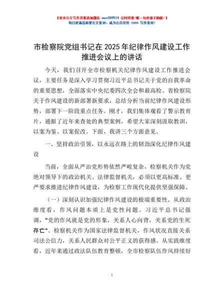 / 市检察院党组书记在2025年纪律作风建设工作推进会议上的讲话