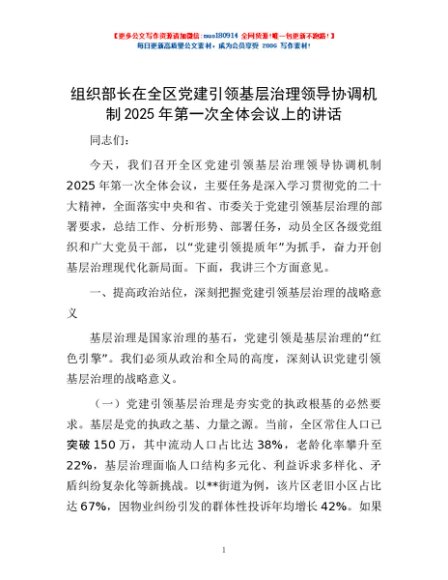 / 组织部长在全区党建引领基层治理领导协调机制2025年第一次全体会议上的讲话