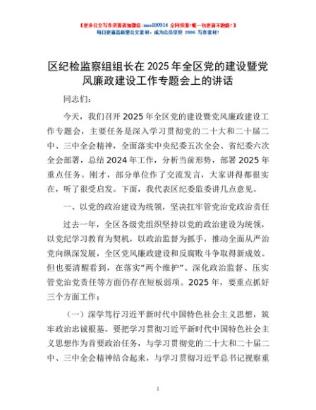 / 区纪检监察组组长在2025年全区党的建设暨党风廉政建设工作专题会上的讲话