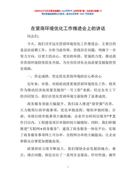 / 在营商环境优化工作推进会上的讲话