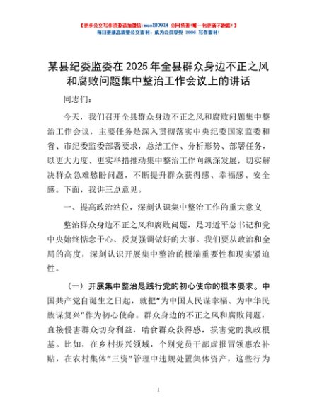 / 某县纪委监委在2025年全县群众身边不正之风和腐败问题集中整治工作会议上的讲话